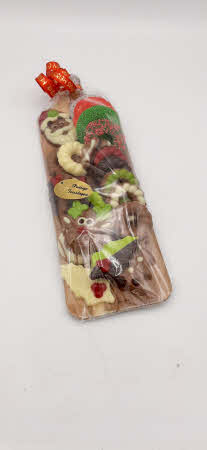 Op het plankje 15 chocolaatjes, bestaande uit Ster, Sneeuwpop, Kerstboom, Rendier, chocolade kransjes, gevulde kransjes met musket, chocolade hulst blaadjes.